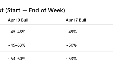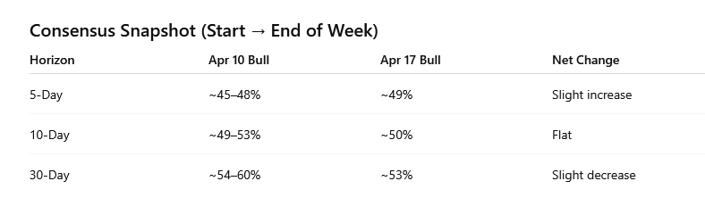 Bullish probabilities spiked midweek, then reset, and ended only slightly higher overall